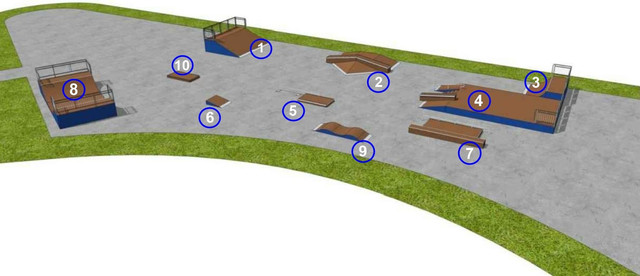 Кол-во фигур в проекте: 10 (бэнк– 1шт., фанбокс с трансфером – 1шт., квотерпайп – 1шт., скейт-плаза – 1шт., мэнуал пэд – 1шт., кикер– 1шт., мэнуал пэд – 1шт., мини-рампа – 1шт., дабл вэйв – 1шт., мэнуал пэд – 1шт.).